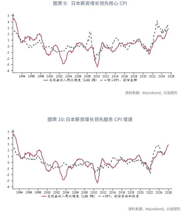 近两年薪资的增长能否支持服务类通胀平稳反弹呢?答案在2025财年是肯定的。我们发现日本薪资的增速领先核心CPI(剔除生鲜)大约2个月时间,领先服务类通胀——剔除食品和能源后的CPI大约9个月时间。这意味着年内服务类通胀反弹的动能相对平稳,至于2026财年能否延续涨势还需继续观察薪资的增长情况。