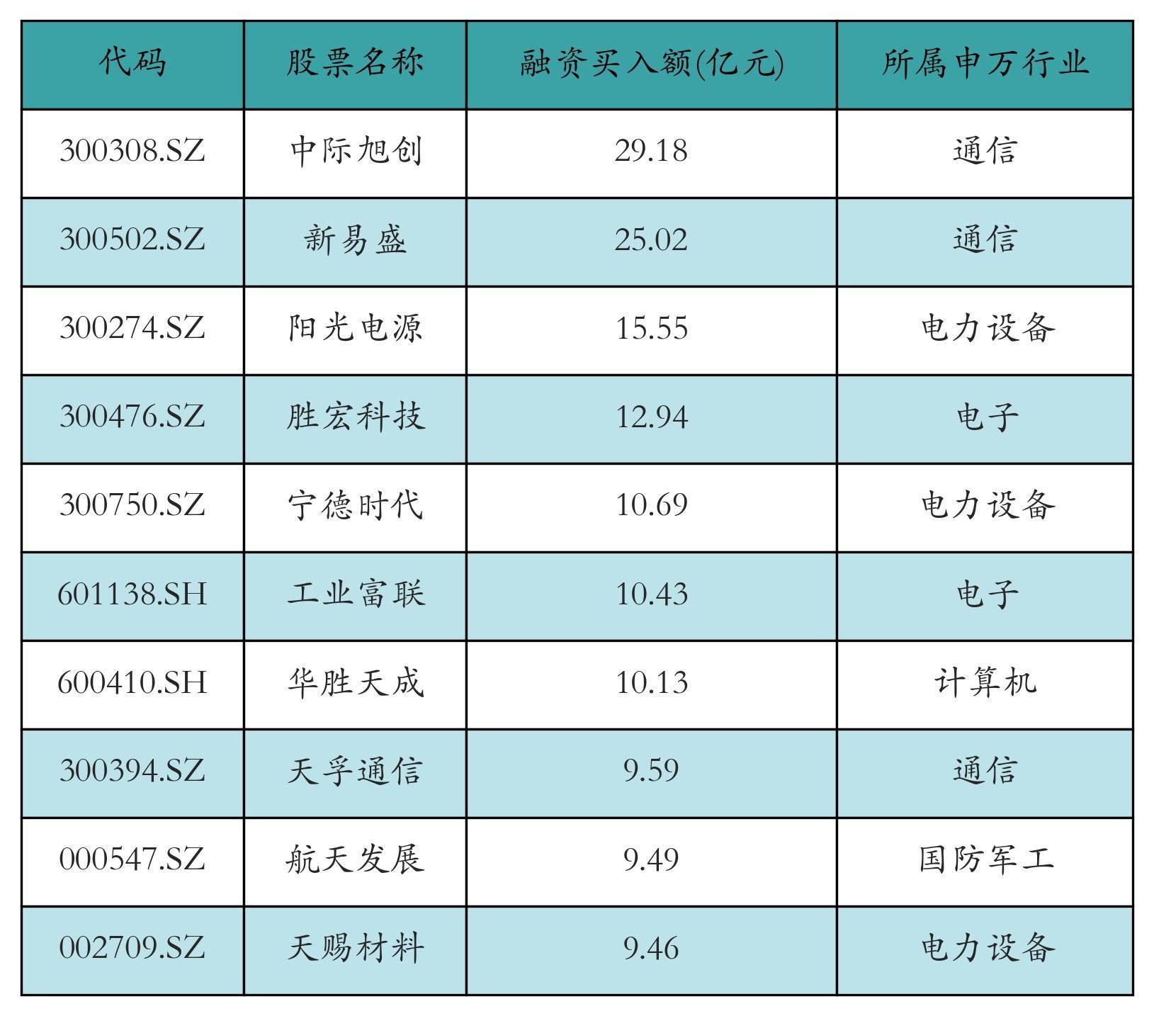 两市共有3460只个股有融资资金买入,其中中际旭创、新易盛、阳光电源排名前三,买入金额分别29.18亿元、25.02亿元、15.55亿元。融资买入额前10个股详情见下表: